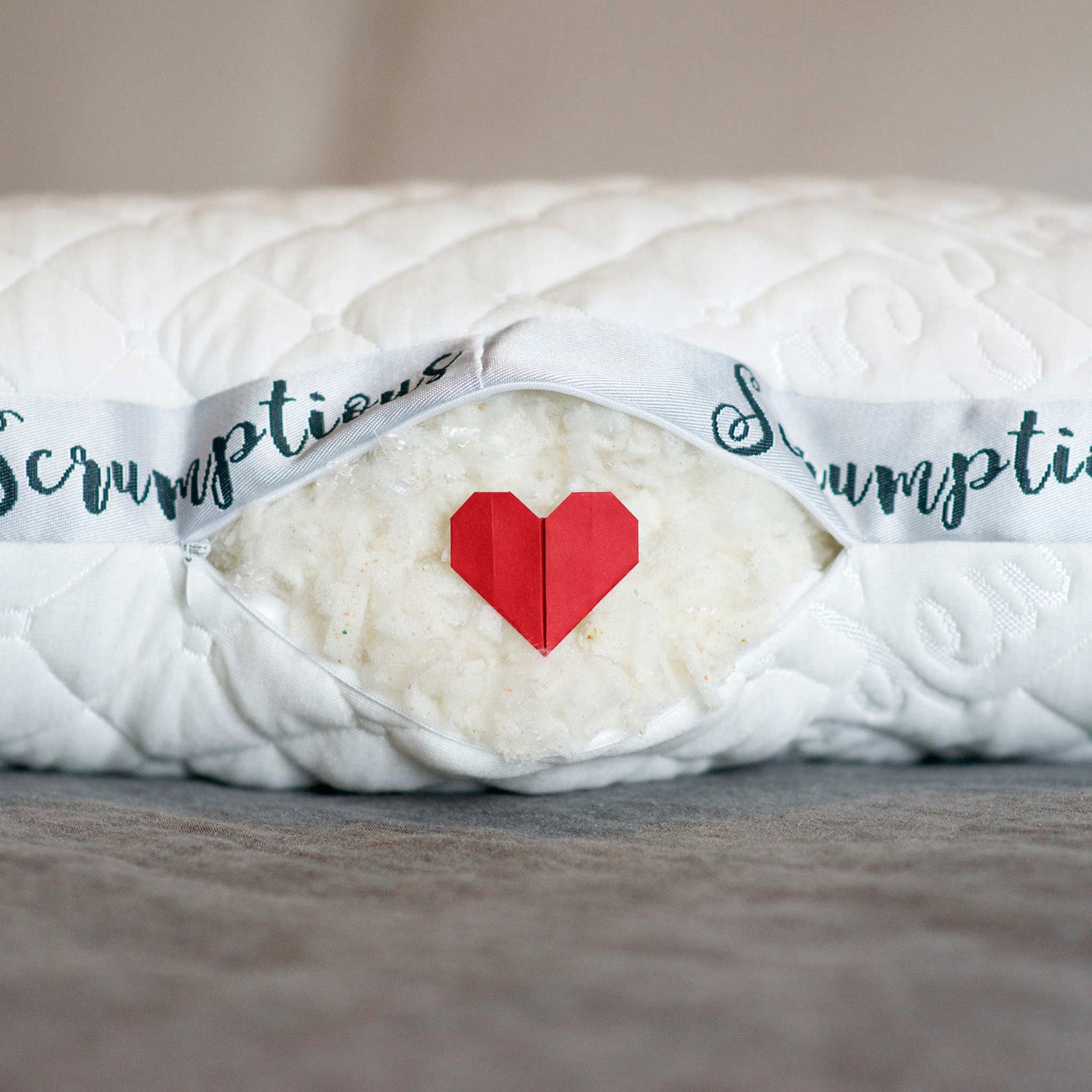 Unlike other pillows that taper at the edges and get higher in the middle, our Scrumptious Pillow maintains its height much more consistently over the entire surface. This means you won’t find yourself rolling over in the night onto the “flat part” of the pillow.
